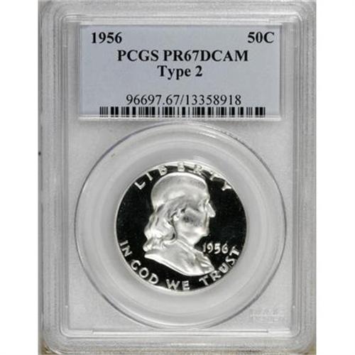 <B>1956 50C Type Two PR67 Deep Cameo PCGS.</B></I> PCGS Population (223/388). NGC Census: (64/139). Numismedia Wsl. Price for NGC/PCGS coin in PR67: $150. (#96697)<BR><BR><b>Shipping:</b> Coins & Currency (<a target="_blank" href="http://www.heritageauctions.com/common/shipping.php">view shipping information</a>)