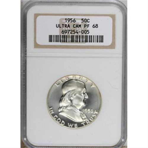 <B>1956 50C Type Two PR68 Deep Cameo NGC.</B></I> NGC Census: (131/8). PCGS Population (348/39). Numismedia Wsl. Price for NGC/PCGS coin in PR68: $420. (#96697)<BR><BR><b>Shipping:</b> Coins & Currency (<a target="_blank" href="http://www.heritageauctions.com/common/shipping.php">view shipping information</a>)