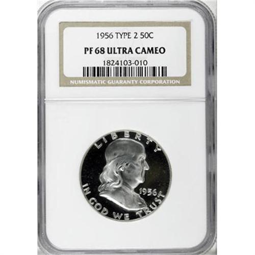 <B>1956 50C Type Two PR68 Deep Cameo NGC.</B></I> NGC Census: (131/8). PCGS Population (349/39). Numismedia Wsl. Price for NGC/PCGS coin in PR68: $410. (#96697)<BR><BR><b>Shipping:</b> Coins & Currency (<a target="_blank" href="http://www.heritageauctions.com/common/shipping.php">view shipping information</a>)