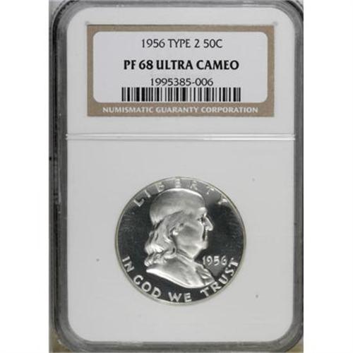 <B>1956 50C Type Two PR68 Deep Cameo NGC.</B></I> NGC Census: (131/8). PCGS Population (349/39). Numismedia Wsl. Price for NGC/PCGS coin in PR68: $400. (#96697)<BR><BR><b>Shipping:</b> Coins & Currency (<a target="_blank" href="http://www.heritageauctions.com/common/shipping.php">view shipping information</a>)