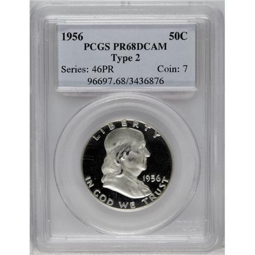 <B>1956<50C> Type Two PR68 Deep Cameo PCGS.</B></I> Outstanding, deep frost bathes the devices and legends. Only the occasional device highpoint lacks full frost. The jet-black fields exhibit exceptional reflectivity. The high relief eagle subtype, as are most proof 1956 Franklins. <BR><BR><B>Important notice:</B> Heritage usually auctions material at the rate of 200-250 lots per hour. On some occasions eBay Live bid software or the Internet may not be able to keep up with the pace of the auction. We recommend placing a realistic absentee bid now as insurance to avoid disappointment. Occasionally the auctioneer may eliminate or reject an eBay Live bid, and the auctioneer may also reopen a lot after the close of the eBay live bidding (usually because we missed an audience bid), and may reject your bid even if it shows you as the winning bidder. By bidding via eBay Live, you agree that Heritage may award the lot to another bidder at its sole discretion under the circumstances described above or any other reasonable circumstances. Since eBay bids are not shown to us until we open the lot on the floor, we treat those bids just like floor bids. In most cases the floor responds before the eBay bid is presented to us, due to Internet lag time, so for consistency we have made it a policy that floor bids are always considered first over tie eBay live bids. Also please note that all Heritage lots purchased through eBay Live carry a 20% Buyer's Premium. Please make sure you read the Terms and Conditions before you bid. This lot is being auctioned in conjunction with a live floor auction by Heritage Galleries & Auctioneers. All final auction and invoice information will be supplied by Heritage Galleries & Auctioneers, and all other information should be considered preliminary. Lot:3154 <BR><BR><B>Winning Notification and Billing:</B> After the FINAL session in this auction is complete, Heritage will send e-mail and snail mail invoices. This process normally takes several days. All final auction and invoice information will be supplied by Heritage Galleries & Auctioneers, and all other information should be considered preliminary. <BR><BR>This auction will be conducted on a live auction floor and over the Internet through eBay Live. If you choose to place an absentee bid, please take a moment to <font color='#0000ff'><u><a href='http://pages.ebay.com/liveauctions/help/before/laabsentee.html'>learn how eBay Live absentee bidding works</a></u></font><font color='#000000'>