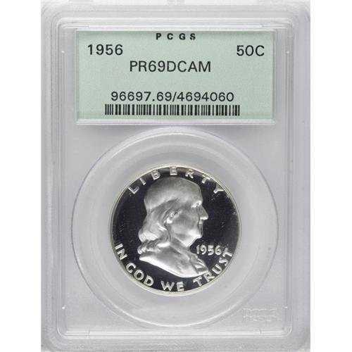 <B>1956 50C Type Two PR69 Deep Cameo PCGS.</B></I> Remarkable white on black contrast between the thickly frosted motifs and the darkly reflective fields proclaim the eye appeal of this brilliant and virtually perfect specimen. Only a minuscule portion of the proof mintage can offer comparable contrast. Certified in a green label holder. Population: 39 in 69 Deep Cameo, 0 finer (11/06).<BR><BR><b>Shipping:</b> Coin/Currency (<a target="_blank" href="http://www.heritageauctions.com/common/shipping.php">view shipping information</a>)