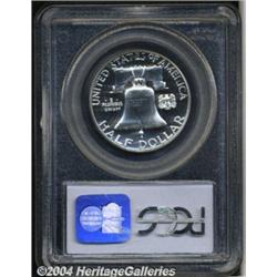 <B>1956<50C> Type Two PR69 PCGS.</B></I> A frosty portrait provides pleasing cameo contrast on the obverse, although this splendid specimen does not possess a Cameo designation since the reverse has only mild white on black distinction. A fully brilliant, nicely struck, and pristine example. Population: 28 in 69, 0 finer (3/04). <BR><BR><B>Important notice:</B> Heritage usually auctions material at the rate of 200-250 lots per hour. On some occasions eBay Live bid software or the Internet may not be able to keep up with the pace of the auction. We recommend placing a realistic absentee bid now as insurance to avoid disappointment. Occasionally the auctioneer may eliminate or reject an eBay Live bid, and the auctioneer may also reopen a lot after the close of the eBay live bidding (usually because we missed an audience bid), and may reject your bid even if it shows you as the winning bidder. By bidding via eBay Live, you agree that Heritage may award the lot to another bidder at its sole discretion under the circumstances described above or any other reasonable circumstances. Since eBay bids are not shown to us until we open the lot on the floor, we treat those bids just like floor bids. In most cases the floor responds before the eBay bid is presented to us, due to Internet lag time, so for consistency we have made it a policy that floor bids are always considered first over tie eBay live bids. Also please note that all Heritage lots purchased through eBay Live carry a 20% Buyer's Premium. Please make sure you read the Terms and Conditions before you bid. </span></font></tr></table></td></tr></table>
