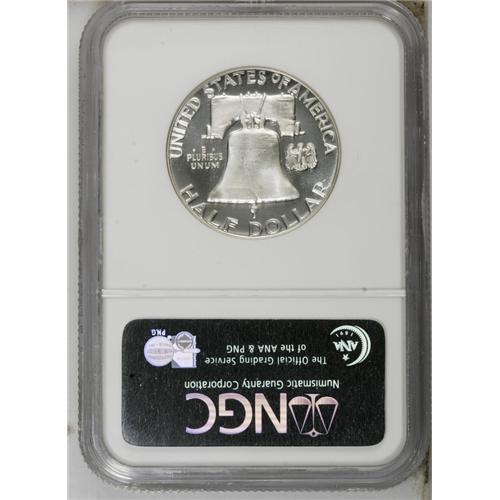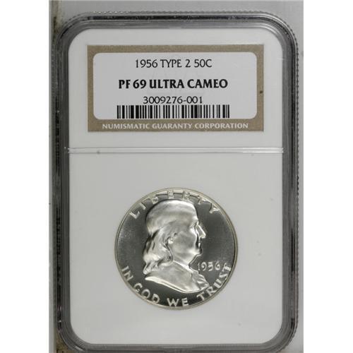 <B>1956 50C Type Two PR69 Ultra Cameo NGC.</B></I> Light specks of violet toning are noted at the obverse periphery of this otherwise black-and-white example. Richly frosted and practically flawless. Census: 8 in 69 Ultra Cameo, 0 finer (10/06).<BR><BR><b>Shipping:</b> Coin/Currency (<a target="_blank" href="http://www.heritageauctions.com/common/shipping.php">view shipping information</a>)