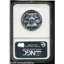 <B>1956 50C Type Two PR69 Ultra Cameo NGC.</B></I> This essentially brilliant specimen is perfect except for the faintest incompletion of strike in the centers. The Type Two reverse (with higher relief on the eagle) was introduced in 1956 and used on all proofs thereafter. Population: 14 in 69 Ultra Cameo, none finer (1/05).<BR><I>From The Mike Jacobson Collection.</B></I> Lot:8341