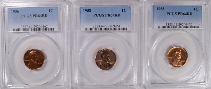 1956 AND ( 2 ) 1958 LINCOLN CENTS, ALL PCGS PROOF-64 RED