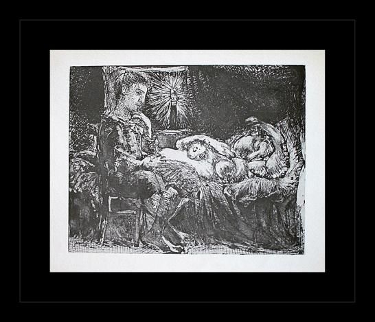 PABLO PICASSO "BOY WATCHING SLEEPING WOMAN BY CANDLELIGHT" - VINTAGE FIRST EDITION LITHOGRAPH AFTER THE SUITE VOLLARD ETCHING - PRINTED IN 1956 - PUBLISHED BY HARRY N. ABRAMS / NEW YORK - PRINTED IN GERMANY - PROFESSIONALLY FRAMED AND MATTED - SHEET SIZE 9"X11"