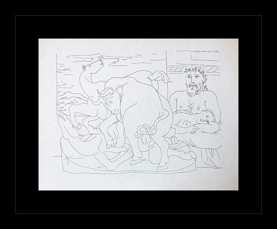 PABLO PICASSO "SCULPTOR, MODEL, SCULPTURE OF A BULL AND TWO HORSES" - VINTAGE FIRST EDITION LITHOGRAPH AFTER THE SUITE VOLLARD ETCHING - PRINTED IN 1956 - PUBLISHED BY HARRY N. ABRAMS / NEW YORK - PRINTED IN GERMANY - PROFESSIONALLY FRAMED AND MATTED - SHEET SIZE 9"X11"