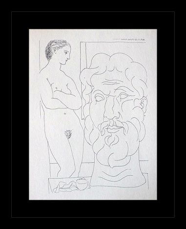 PABLO PICASSO "MODEL AND SCULPTURED HEAD" - VINTAGE FIRST EDITION LITHOGRAPH AFTER THE SUITE VOLLARD ETCHING - PRINTED IN 1956 - PUBLISHED BY HARRY N. ABRAMS / NEW YORK - PRINTED IN GERMANY - PROFESSIONALLY FRAMED AND MATTED - SHEET SIZE 9"X11"