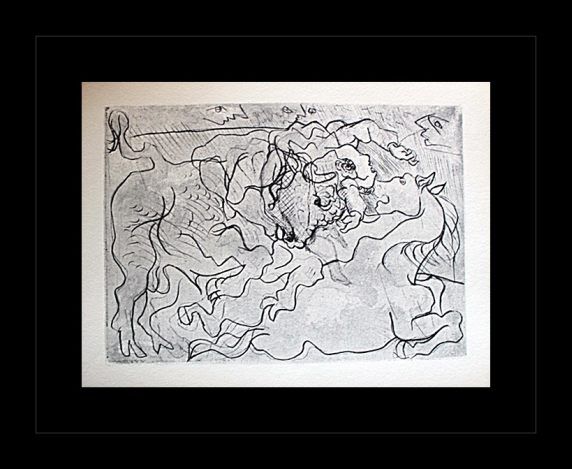 PABLO PICASSO "BULLFIGHT II" - VINTAGE FIRST EDITION LITHOGRAPH AFTER THE SUITE VOLLARD ETCHING - PRINTED IN 1956 - PUBLISHED BY HARRY N. ABRAMS / NEW YORK - PRINTED IN GERMANY - PROFESSIONALLY FRAMED AND MATTED - SHEET SIZE 9"X11"