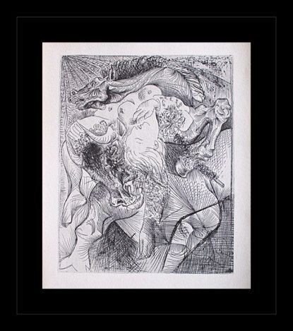 PABLO PICASSO "TWO MEN WITH MINOTAUR AND SCULPTURED BIRD" - VINTAGE FIRST EDITION LITHOGRAPH AFTER THE SUITE VOLLARD ETCHING - PRINTED IN 1956 - PUBLISHED BY HARRY N. ABRAMS / NEW YORK - PRINTED IN GERMANY - PROFESSIONALLY FRAMED AND MATTED - SHEET SIZE 9"X11"