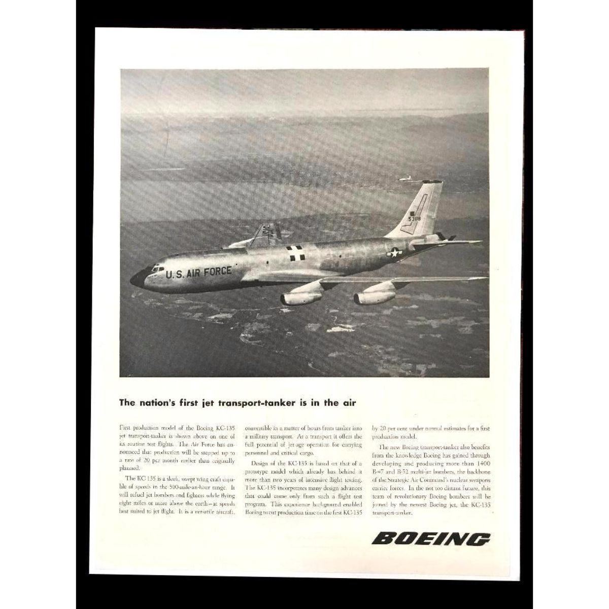 Original 1956 magazine advertisement for Boeing jets - 1st production model of the KC-135 transport tanker. Black & white ad. 11" X 14" mounted on archival linen canvas for preservation.