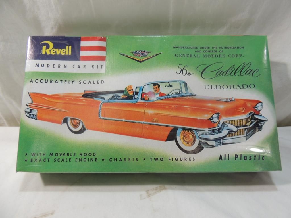 REVELL 1956 CADILLAC ELDORADO PLASTIC MODEL KIT. WITH MOVABLE HOOD. EXACT SCALE ENGINE CHASSIS TWO FIGURES. ALL PLASTIC. NEW NEVER OPENED AS SHOWN SEE PHOTO FOR MORE DETAILS.