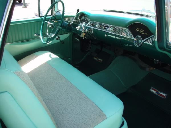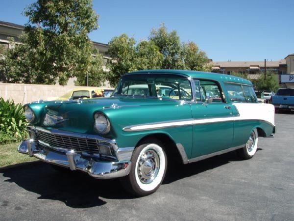 A stunning restored 56 Nomad with factory 265 V8, original two tone color combo, two tone original style interior, power steering, upgraded automatic overdrive transmission, near perfect chrome and stainless, rust free body and chassis with classic wide whites and original hubcaps.