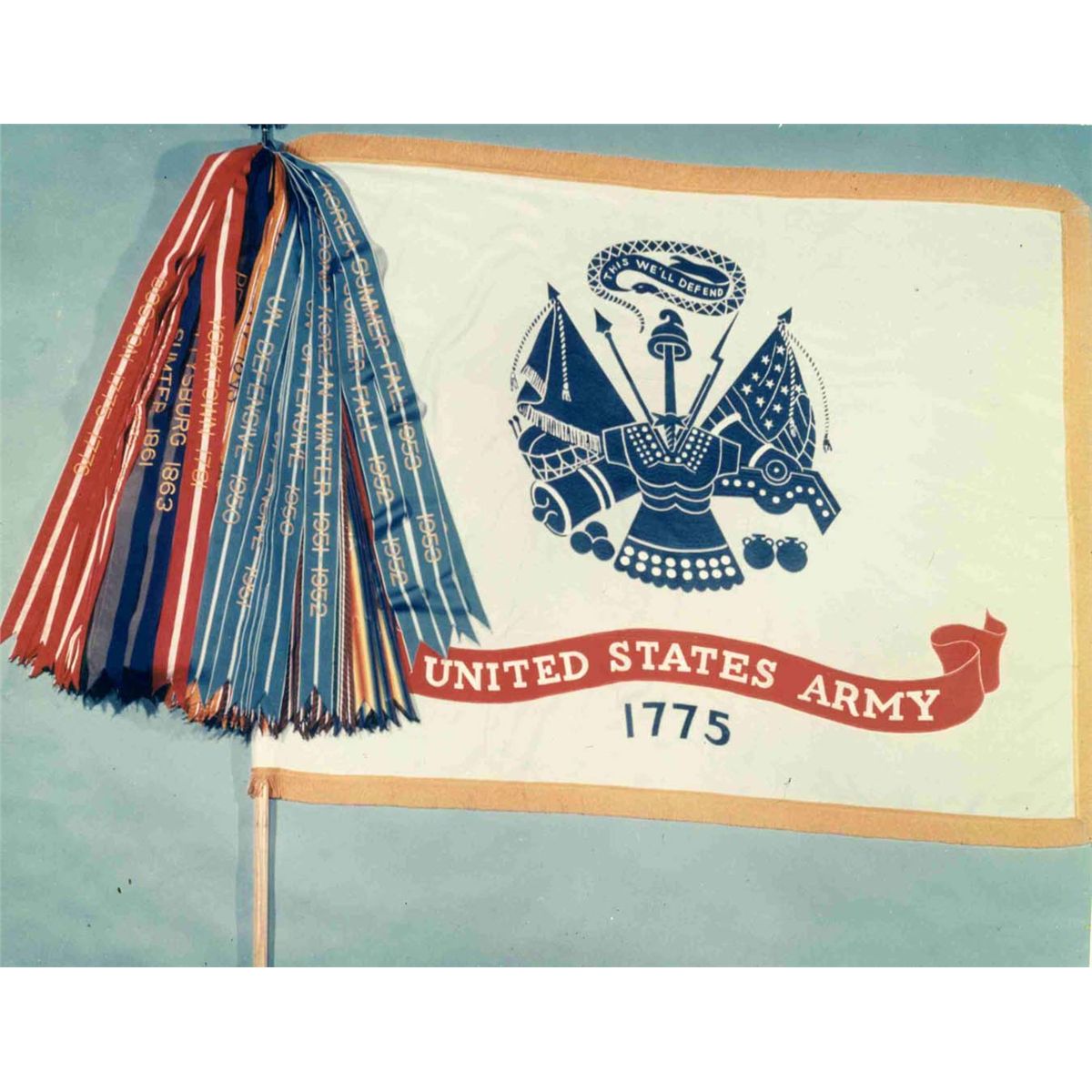 Original color wire photo of the United States Army flag with ribbons of famous American wars and battles attached to it. The ribbons in red and blue with yellow lettering start with Boston and conclude with the Korean War. Signal Corps stamp on verso dates photo to November 1956. The verso also includes a taped Department of Army information note. The glossy 10'' x 8'' photo has minor spotting and creasing, else very good.