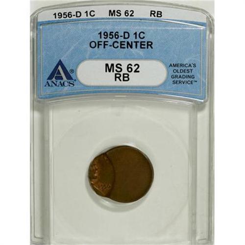 <B>1956-D 1C Lincoln Cent--Off Center--MS62 Red & Brown ANACS.</B></I> <BR><BR><B>Coin Engraver:</B> Victor D. Brenner<BR><BR><b>Shipping:</b> Coins & Currency (<a target="_blank" href="http://www.heritageauctions.com/common/shipping.php">view shipping information</a>)