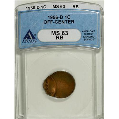 <B>1956-D 1C Cent--Off Center--MS63 Brown ANACS.</B></I> <BR><BR><B>Coin Engraver:</B> Victor D. Brenner<BR><BR><b>Shipping:</b> Coins & Currency (<a target="_blank" href="http://www.heritageauctions.com/common/shipping.php">view shipping information</a>)