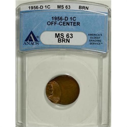 <B>1956-D 1C Cent--Off Center--MS63 Brown ANACS.</B></I> <BR><BR><B>Coin Engraver:</B> Victor D. Brenner<BR><BR><b>Shipping:</b> Coins & Currency (<a target="_blank" href="http://www.heritageauctions.com/common/shipping.php">view shipping information</a>)