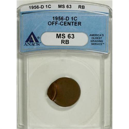 <B>1956-D 1C Cent--Off Center--MS63 Brown ANACS.</B></I><BR><BR><B>Coin Engraver:</B> Victor D. Brenner<BR><BR><b>Shipping:</b> Coins & Currency (<a target="_blank" href="http://www.heritageauctions.com/common/shipping.php">view shipping information</a>)
