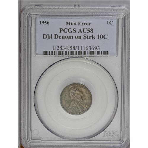 <B>1956-D<1C> Lincoln Cent--Double Denomination on Struck Roosevelt Dime--AU58 PCGS.</B></I> An error coin in an erroneous slab, mislabeled by PCGS as a 1956 P-mint Lincoln. The Lincoln cent is struck, obverse to obverse, about 160 degrees rotated on an already-struck Roosevelt dime. GOD RUST from the dime is visible in Old Abe's hair, with a clear 1956 dime date behind his head, and most of the outline of Roosevelt's head is visible. The major details, date, and mintmark of the Lincoln cent are bold. On the reverse DIME is visible upside-down above ONE (CENT), and the top of the Roosevelt dime torch can be seen in OF AMERICA of the cent. No mintmark from the dime is visible. The edge of the coin, visible through the PCGS slab, is clearly reeded from the original dime planchet. The coin has darkened, but little wear is evident.