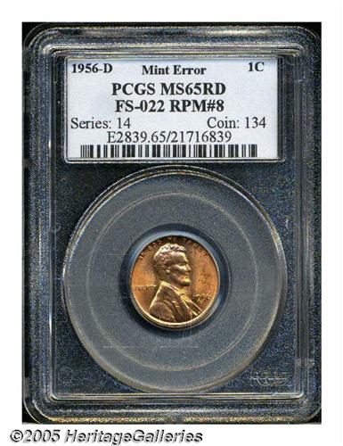 <B>1956-D<1C> MS65 Red PCGS.</B></I> FS-022. RPM-8. The mintmark is very widely repunched south, the secondary mintmark is faint but essentially completely outlined. Boldly struck with booming luster and a few distributed flyspecks.