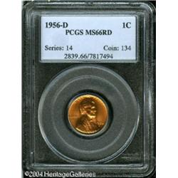 1956-D 1C MS66 Red PCGS. Bright orange patination <B>1956-D 1C MS66 Red PCGS.</B></I> Bright orange patination overlays lustrous surfaces that are virtually devoid of any significant marks. The design elements are well impressed throughout <BR><BR><B>Important notice:</B> Heritage usually auctions material at the rate of 200-250 lots per hour. On some occasions eBay Live bid software or the Internet may not be able to keep up with the pace of the auction. We recommend placing a realistic absentee bid now as insurance to avoid disappointment. Occasionally the auctioneer may eliminate or reject an eBay Live bid, and the auctioneer may also reopen a lot after the close of the eBay live bidding (usually because we missed an audience bid), and may reject your bid even if it shows you as the winning bidder. By bidding via eBay Live, you agree that Heritage may award the lot to another bidder at its sole discretion under the circumstances described above or any other reasonable circumstances. Since eBay bids are not shown to us until we open the lot on the floor, we treat those bids just like floor bids. In most cases the floor responds before the eBay bid is presented to us, due to Internet lag time, so for consistency we have made it a policy that floor bids are always considered first over tie eBay live bids. Also please note that all Heritage lots purchased through eBay Live carry a 20% Buyer's Premium. Please make sure you read the Terms and Conditions before you bid. This lot is being auctioned in conjunction with a live floor auction by Heritage Galleries & Auctioneers. All final auction and invoice information will be supplied by Heritage Galleries & Auctioneers, and all other information should be considered preliminary. Lot:5391