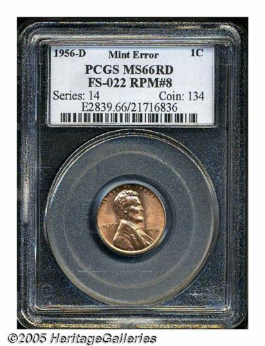 <B>1956-D<1C> MS66 Red PCGS.</B></I> FS-022. RPM-8. A faint but virtually fully outlined secondary mintmark is located directly beneath the primary mintmark. An unusually wide mintmark repunching. A meticulously struck pumpkin-orange premium Gem that has a few miniscule toning flecks.