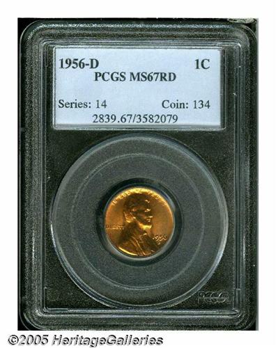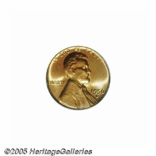 <B>1956-D<1C> MS67 Red PCGS.</B></I> Boldly struck with bright, scintillating luster and unusually vivid red-gold toning on both sides. A handful of tiny nicks are scattered over the two sides, but they are of the near-microscopic variety, only visible with magnification. Surprisingly scarce at this lofty grade level, and none have been graded higher by either of the major services. Population: 14 in 67 Red, 0 finer (6/05).<BR><I>From The William Bickel Collection, Part One.</B></I>