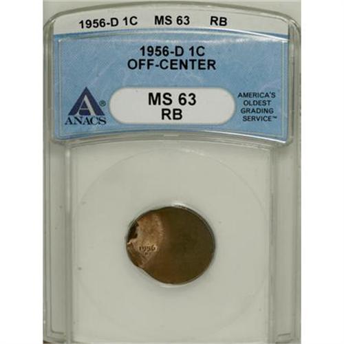 <B>1956-D 1C Lincoln Cent--Off Center--MS63 Red & Brown ANACS.</B></I><BR><BR><B>Coin Engraver:</B> Victor D. Brenner<BR><BR><b>Shipping:</b> Coins & Currency (<a target="_blank" href="http://www.heritageauctions.com/common/shipping.php">view shipping information</a>)