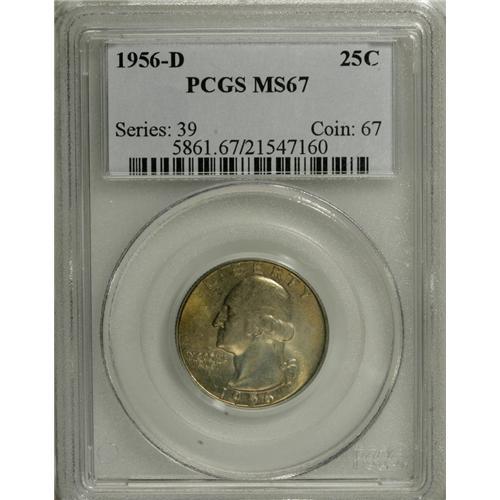 <B>1956-D 25C MS67 PCGS.</B></I> Iridescent gold, crimson, and lime-green hues grace this lustrous Superb Gem. The design features are well impressed. A few trivial marks on the major devices are hardly worthy of mention. A formidable addition to the competitive Registry holding. Population: 11 in 67, 0 finer (1/07).<BR><BR><b>Shipping:</b> Coins & Currency (<a target="_blank" href="http://www.heritageauctions.com/common/shipping.php">view shipping information</a>)