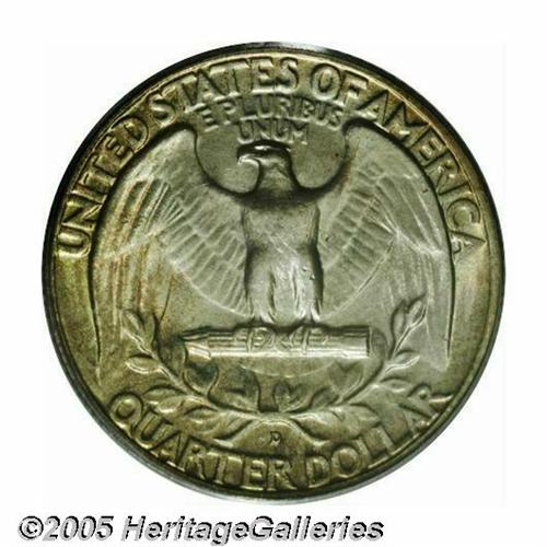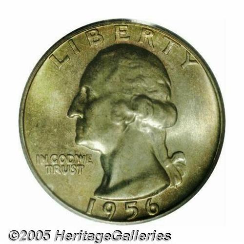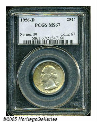<B>1956-D<25C> MS67 PCGS.</B></I> Pleasing medium intensity gold, crimson, and lime-green hues visit lustrous hues on each side. The design features are well impressed. A few trivial marks on Washington's hair, and the eagle's wings and right (facing) leg are mentioned for the sake of accuracy. Population: 10 in 67, 0 finer (3/05).<BR><I>From The Gary Kramer Collection of Washington Quarters.</B></I>