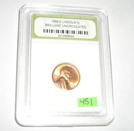 1956-D LINCOLN WHEAT PENNY CERTIFIED BY INB *BRILLIANT UNCIRCULATED* SERIAL # 2213928342!! COIN CAME OUT OF ESTATE SAFE!! ***Coin, Currency & All Items Listed in this auction - Grades, Conditions and Values are not Safe Deposit Coins LLC Responsibilty. Grades, Condition and Values are determined by Consigner(s) & Buyers ONLY