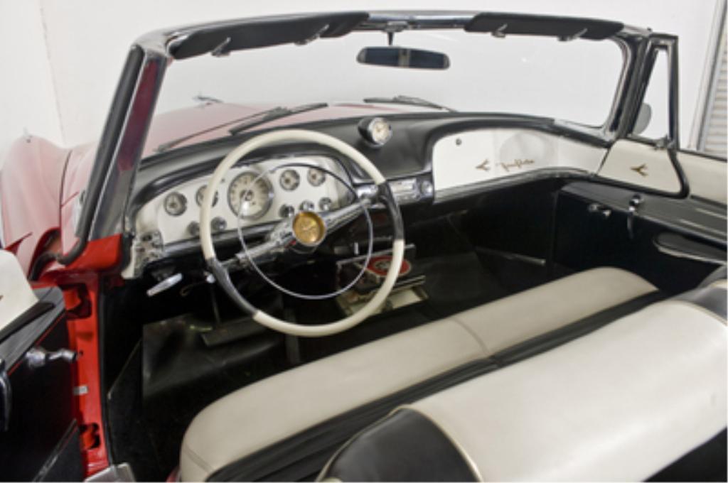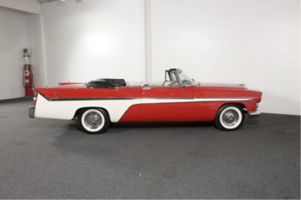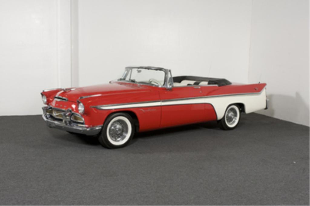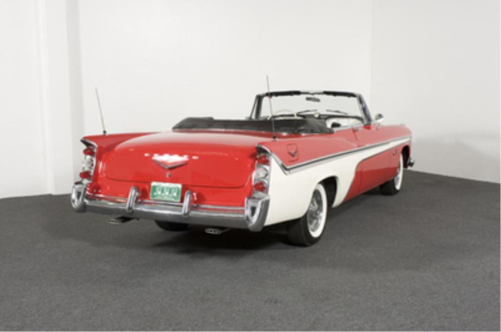 1956 DeSoto FireFlite Hemi Convertible 331 cid Hemi V8 rated at 255 horsepower, Carter dual four-barrel carburetors, three-speed TorqueFlite automatic transmission, independent front suspension, live rear axle and power drum brakes front and rear; wheelbase: 126"-With only 1,485 built, the rare Ñ56 Desoto Fireflite was selected as the official Indy 500 Pace Car when new. Power was derived from a two-four barrel-topped Hemi motor as seen in this example. The black and white pleated leather interior is in like-new condition and is home to a pushbutton automatic transmission console, Select-O-Matic radio, and rare under-dash Highway Hi-Fi record player. Included with purchase is much documentation and dealer Hi-Fi record for the player. Kelsey-Hayes wire spinner wheels and wide white tires add to an already stunning convertible. The odometer shows 10,408 miles, and the condition of this body-off restored convertible is that of a new car. It must be one of the best examples to be found as it is in wonderful condition from top to bottom. These cars do not come around often and should be considered