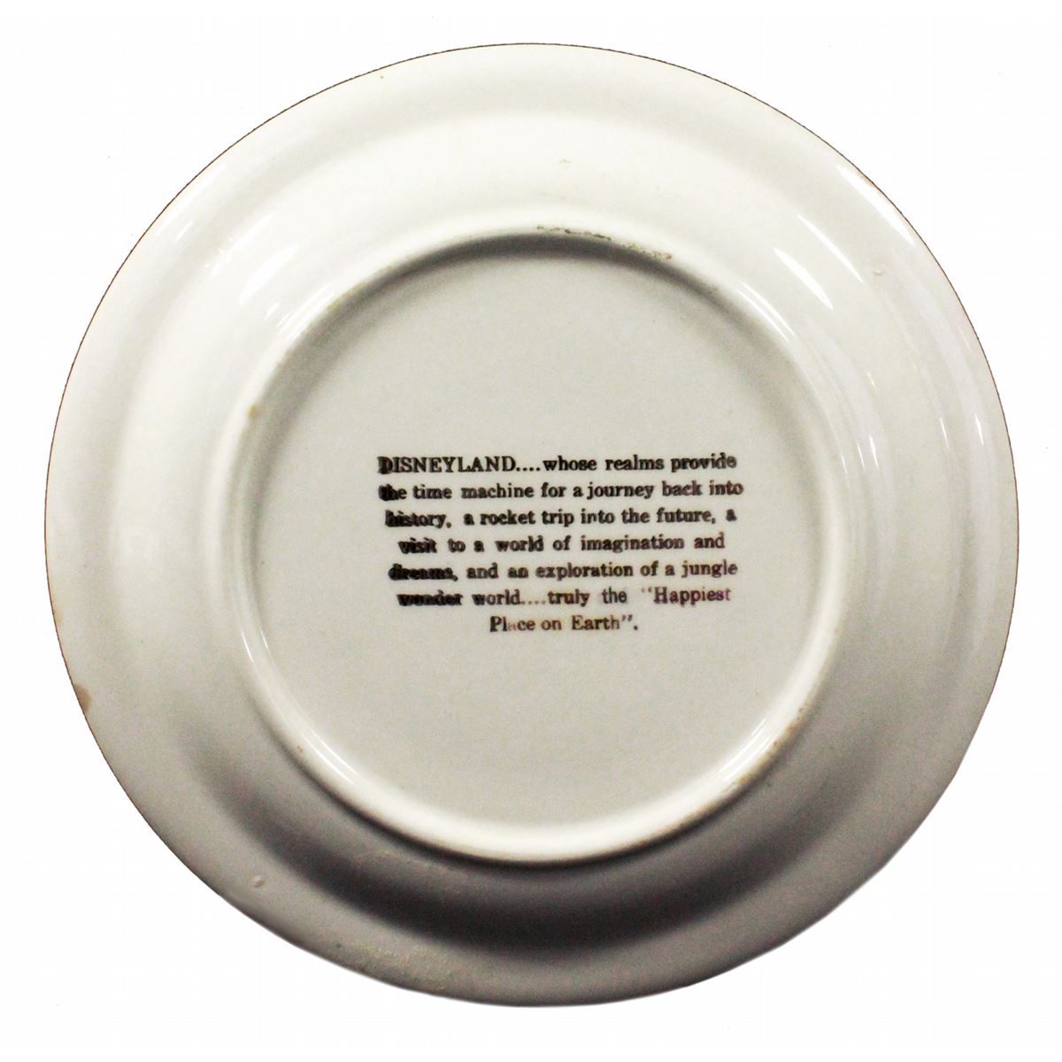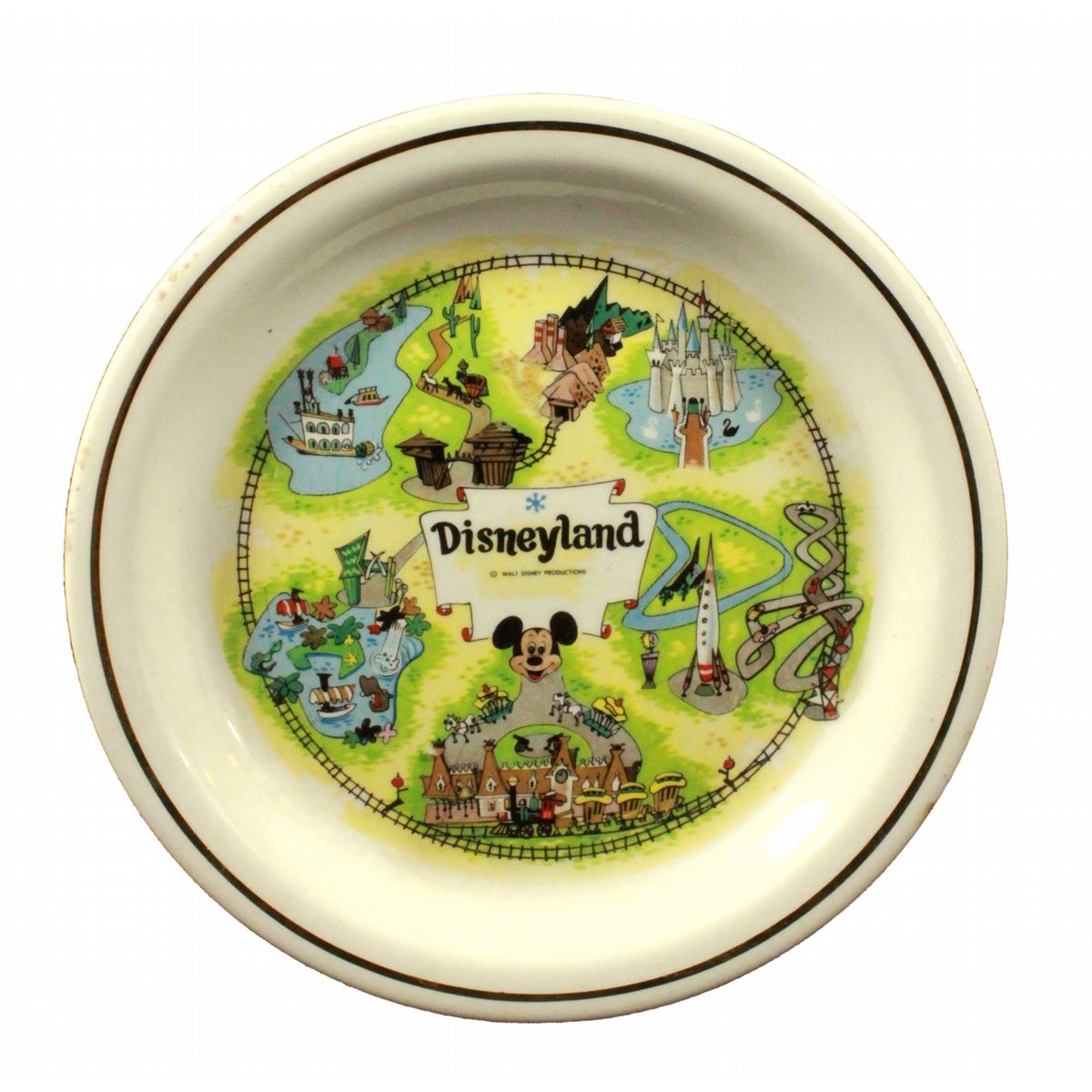 A beautiful ceramic plate depicting a map of the park with the text "Disneyland" over an image of Mickey in the center. Charming imagery. Measures 7.25" in diameter. Fine condition with some wear around the rim and some discoloration in various spots.