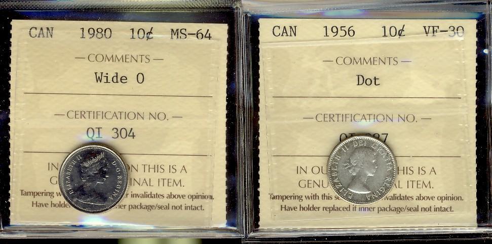 1956 Dot VF30 & 1980 Wide 0 10¢ MS64. Lot of 2 variety coins.