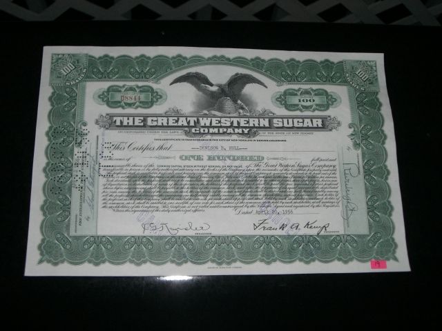 1956 EXTREMELY RARE 100 SHARES STOCK CERTIFICATE *THE GREAT WESTERN SUGAR COMPANY - NICE STOCK CERTIFICATE*!! ***Coin, Currency & All Items Listed in this auction - Grades, Conditions and Values are not Safe Deposit Coins LLC Responsibilty. Grades, Condition and Values are determined by Consigner(s) & Buyers ONLY
