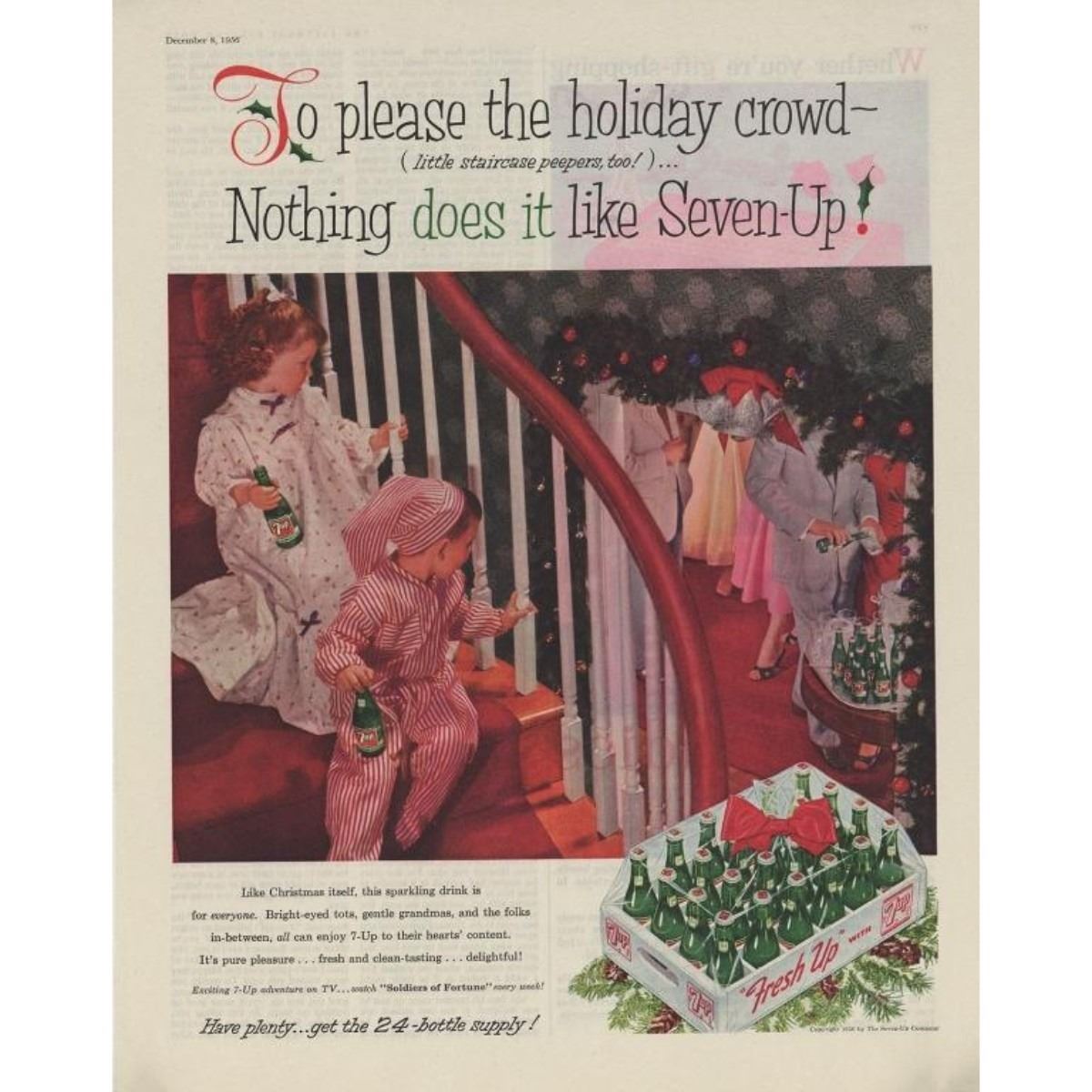 1956 Magazine advertisement for 7 Up Soft Drink. Features two little children hiding on the stairs watching a Christmas party below. The slogan reads, " To please the holiday crowd - ( little staircase peepers, too! )... Nothing does it like Seven-Up!" Approx 10" X 13" image size. Mounted on canvas for preservation.