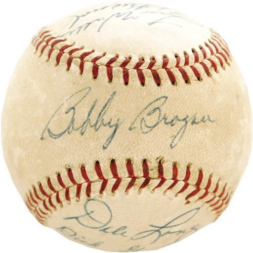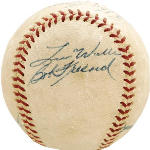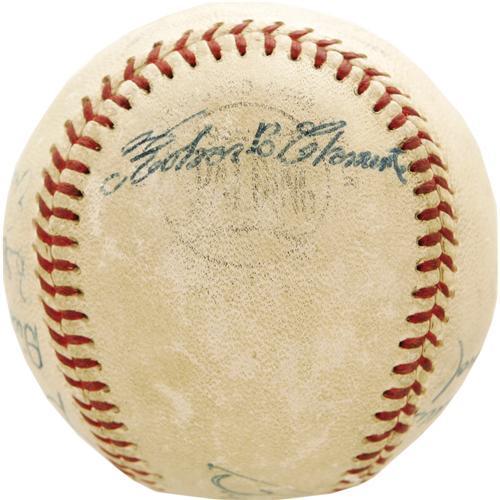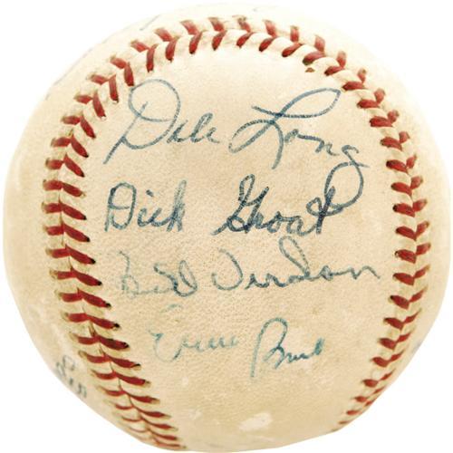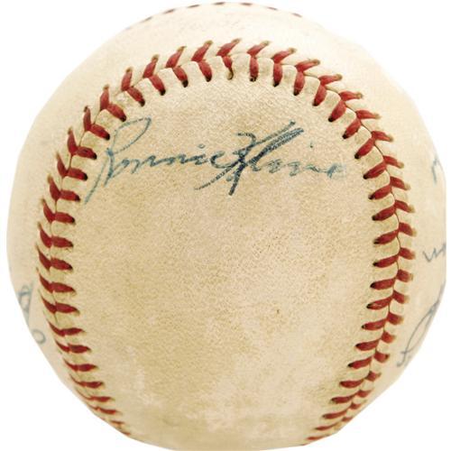 <B>Circa 1956 Roberto Clemente Signed Baseball.</B></I> A strong blue ink signature over the Spalding stamping on this ONL (Giles) ball finds the Pittsburgh Pirates hero in his most desirable rookie-era style. The important autograph presents quite convincingly as a single, though eight others have lent their names to the cause, most notably fellow Pirates Groat, Virdon and Friend and Chicago Cubs Hall of Famer Ernie Banks. All signatures rate better than 8/10. A great opportunity to own a strong, early Clemente on a baseball at a reasonable price. <I>LOA from PSA/DNA.</B></I>