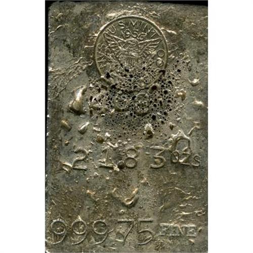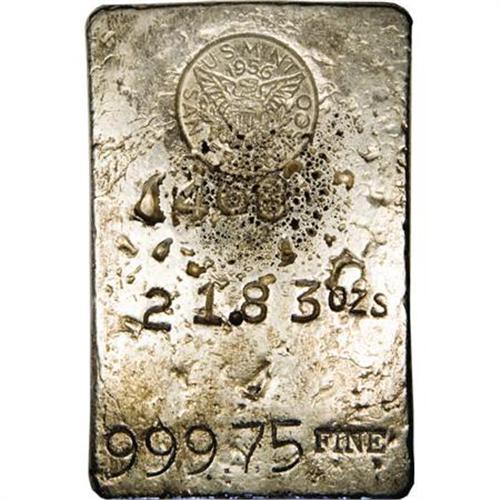 <B>1956 San Francisco Mint Silver Ingot. 21.83 Ounces.</B></I><BR> A rectangular ingot of high grade silver with the imprint deeply pressed into the top of the front side, followed by 21.83 OZS / 999.75 FINE. The short bottom side has the number 249 impressed. Bright, silvery surfaces; a few gas bubbles are evident on the lower portion of the imprint. Measures: 58 x 90 mm.<BR><BR><b>Shipping:</b> Coins & Currency (<a target="_blank" href="http://www.heritageauctions.com/common/shipping.php">view shipping information</a>)
