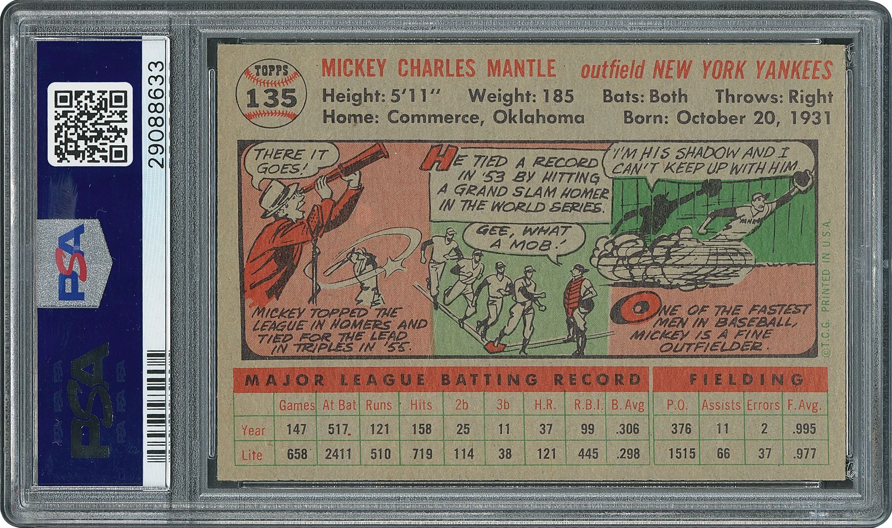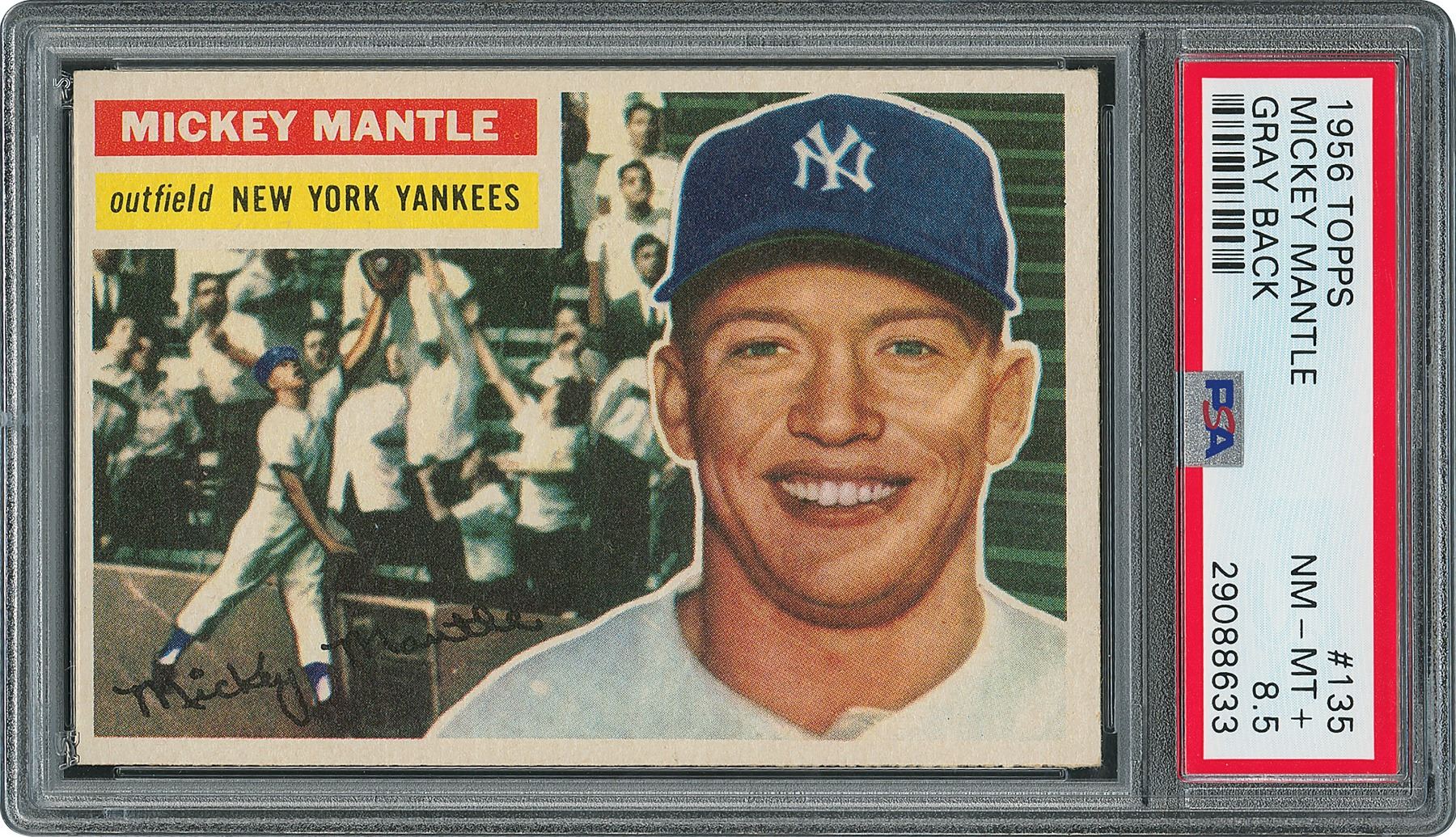 Graded by PSA NM-MT+ 8.5. With the exception of his two rookie cards, the 1956 Topps Mickey Mantle is arguably his most popular card. Issued during the Mick's Triple Crown season, the bright portrait of a smiling Mantle along with the imagery of his athleticism in the 'action' shot really showcases this issue. Four sharp corners, the aforementioned bright color, and smooth surfaces correspond with the accurate assessment by PSA.