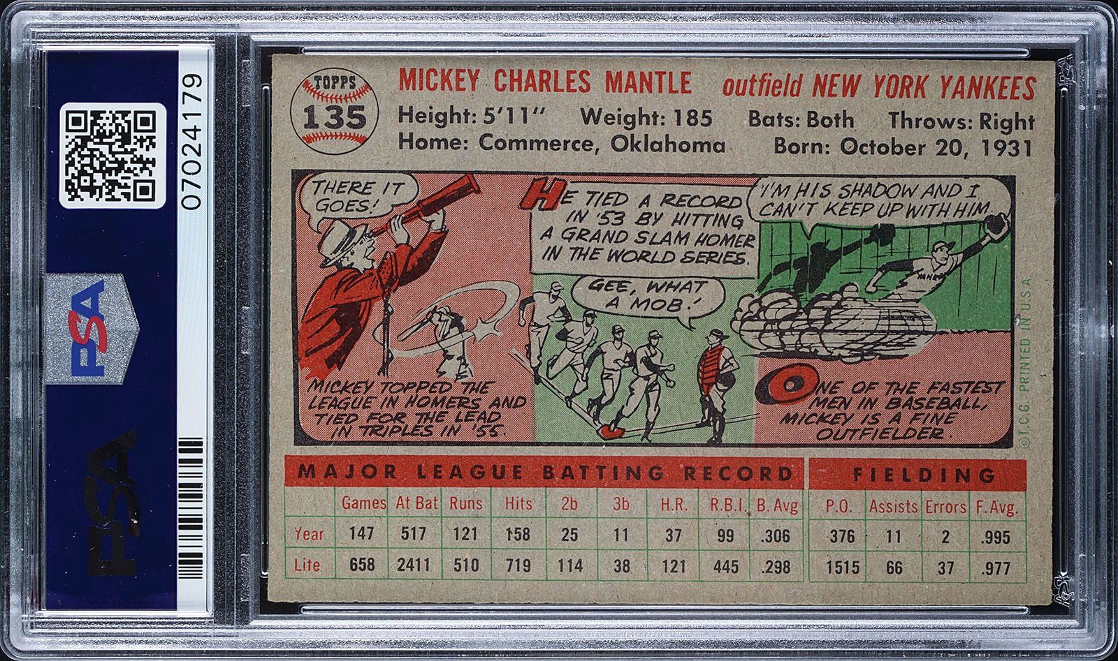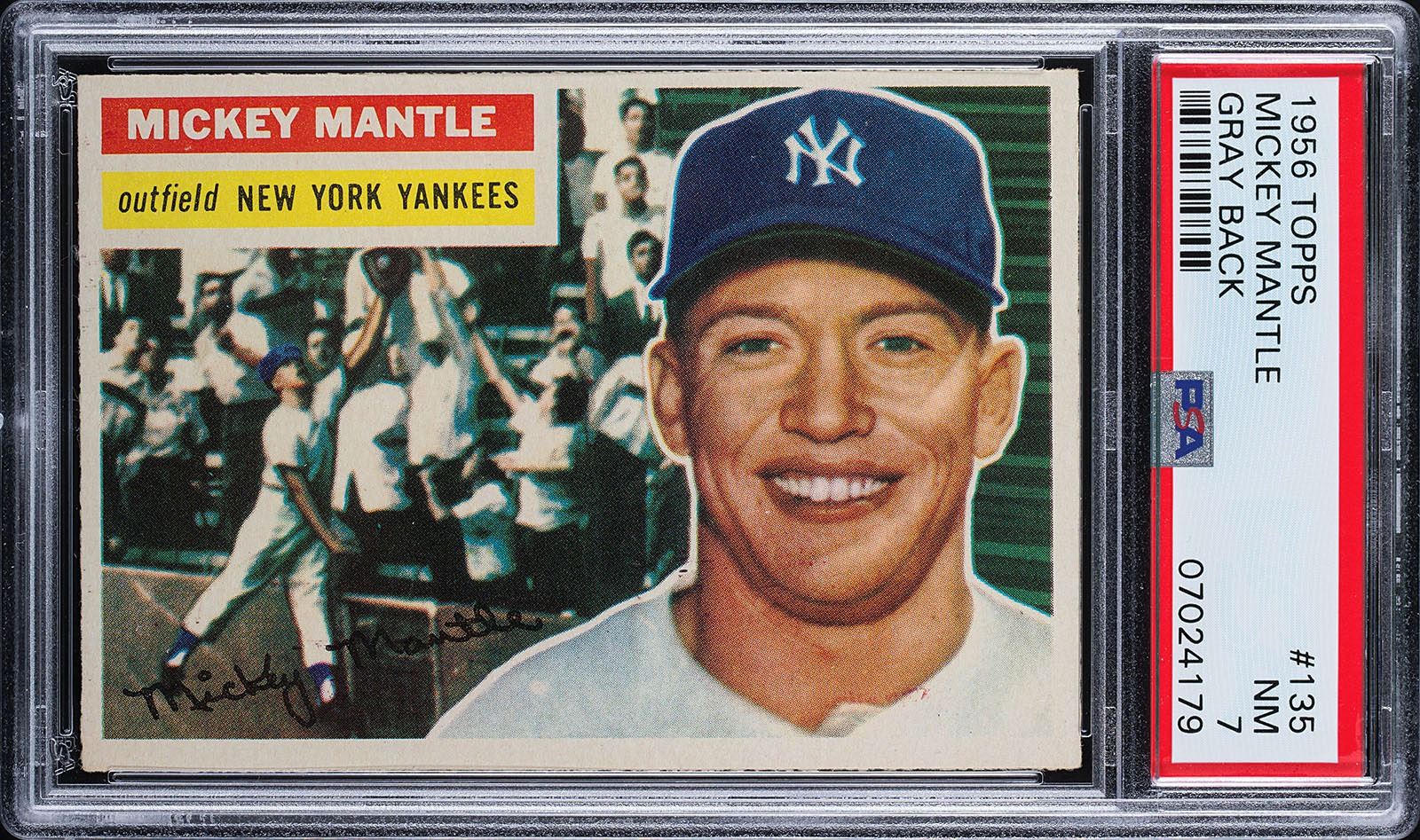 Graded by PSA NM 7. Bold colors highlight this amazing card of Mickey Mantle. Issued during his Triple Crown season, it was also the first of his three MVP seasons. Very bold color, four square corners, and centered slightly to the top. This is one of the most popular, and highly desired Topps cards in the entire hobby.
