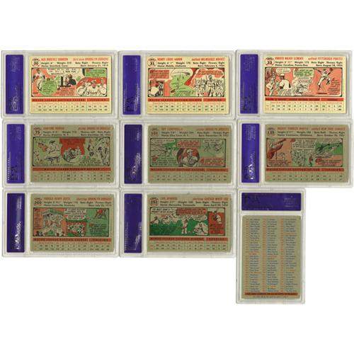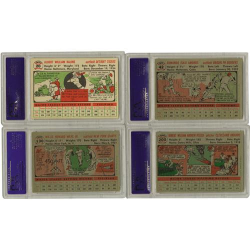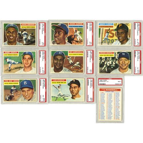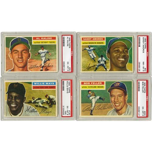 <B>1956 Topps Baseball Complete Set (342).</B></I> Innovations found in the 1956 Topps set include team cards as part of the regular set and cards of the two league presidents, William Harridge and Warren Giles. Additionally, there are two unnumbered checklist cards which are present with this set. A total of thirteen cards have been graded by PSA with an aggregate SMR value of $1984. Graded cards - <B>PSA 8:</B></I> #42 Amoros, 260 Reese; <B>PSA 7:</B></I> #101 Campanella, 292 Aparicio, Checklist 1/3; <B>PSA 6:</B></I> #20 Kaline, 33 Clemente, 130 Mays (MK), 200 Feller; <B>PSA 5:</B></I> #30 Robinson, 31 Aaron; <B>PSA 4:</B></I> #79 Koufax, 135 Mantle. Ungraded cards include #1 Harridge (VG), 5 Williams (G), 10 Spahn (EX/MT), 14 Boyer (NM), 15 Banks (EX), 20 Kaline (EX/MT), 107 Mathews (VG/EX), 110 Berra (VG/EX), 113 Rizzuto (EX/MT), 120 Ashburn (VG), 145 Hodges (EX), 150 Snider (VG/EX), 164 Killebrew (VG/EX), 166 Dodgers (VG/EX), 180 Roberts (EX/MT), 181 Martin (EX), 187 Wynn (VG/EX), 200 Feller (EX/MT), 226 Giants (EX), 240 Ford (EX), 251 Yankees (VG/EX), 332 Larsen (EX), 340 McDermott (VG/EX), CL 2nd/4th Series (VG/EX). Grades 68% EX to EX/MT (some better), 27% VG to VG/EX, 5% lesser due to writing on the card.