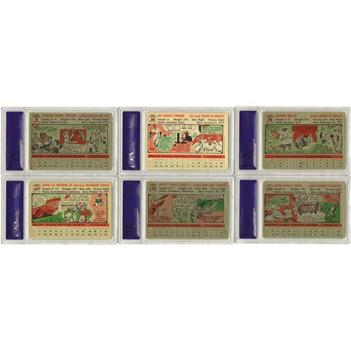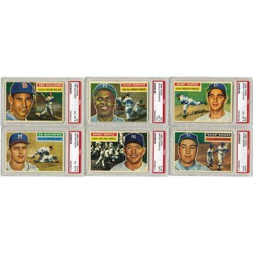 <B>1956 Topps Baseball Complete Set (342).</B></I> The 1956 Topps issue is similar in design to the previous year's product, making use of both a portrait and an "action" picture on the card fronts. Additionally, the release included two unnumbered checklist cards that are included with this offering. A total of six cards have been graded by PSA with an aggregate SMR value of $1068. Graded cards - <B>PSA 7:</B></I> #30 Robinson (OC); <B>PSA 6:</B></I> #5 Williams, 107 Mathews; <B>PSA 5:</B></I> #135 Mantle, 150 Snider; <B>PSA 4:</B></I> #79 Koufax. Ungraded cards include #1 Harridge (VG/EX), 10 Spahn (VG/EX), 14 Boyer (VG/EX), 15 Banks (VG/EX), 20 Kaline (VG/EX), 31 Aaron (VG/EX), 33 Clemente (VG/EX), 42 Amoros (EX), 101 Campanella (VG/EX), 110 Berra (EX), 113 Rizzuto (EX), 120 Ashburn (EX), 130 Mays (EX), 145 Hodges (VG), 164 Killebrew (VG/EX), 166 Dodgers (VG/EX), 180 Roberts (VG), 181 Martin (EX), 187 Wynn (EX/MT), 200 Feller (EX), 226 Giants (VG), 240 Ford (VG/EX), 251 Yankees (VG), 260 Reese (VG/EX), 292 Aparicio (VG/EX), 332 Larsen (VG), 340 McDermott (VG/EX), CL 1st/3rd Series (G) and CL 2nd/4th Series (VG/EX). Grades 72% EX to EX/MT (some better), 28% VG to VG/EX (some lesser).