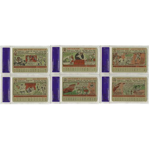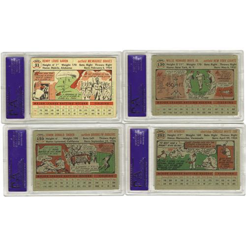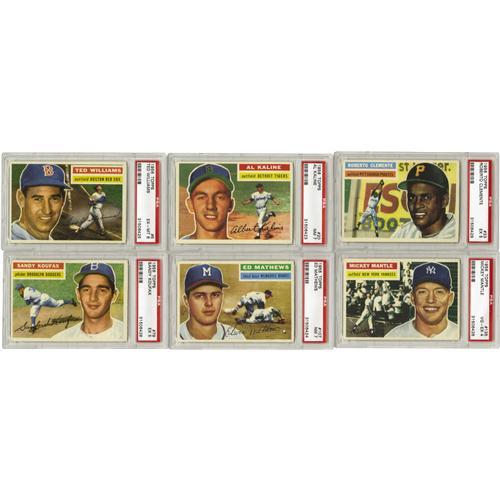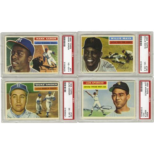 <B>1956 Topps Baseball Complete Set (342).</B></I> This set represents the second consecutive year that Topps employed a horizontal card design featuring both a portrait and an action scene. In addition to the 340-card regular set, there are two unnumbered checklist cards included. A total of 10 cards have been graded by PSA with an aggregate SMR value of $1,437. Includes: Graded Cards - <B>PSA Mint 9:</B></I> #292 Luis Aparicio (OC); <B>PSA NM 7:</B></I> #20 Al Kaline, 107 Ed Mathews; <B>PSA EX-MT 6:</B></I> #5 Ted Wiliams, 150 Duke Snider; <B>PSA EX 5:</B></I> #33 Roberto Clemente, 79 Sandy Koufax; <B>PSA VG-EX 4:</B></I> #31 Hank Aaron, 130 Willie Mays, 135 Mickey Mantle. Ungraded Cards - #1 Harridge (EX), 10 Spahn (EX), 14 Boyer (VG), 15 Banks (VG), 30 Robinson (VG/EX), 42 Amaros (EX/MT), 101 Campanella (EX), 110 Berra (VG/EX), 113 Rizzuto (EX), 120 Ashburn (EX), 145 Hodges (EX), 164 Killebrew (VG/EX), 166 Dodgers Team (VG/EX), 180 Roberts (EX/MT), 181 Martin (VG), 187 Wynn (VG/EX), 200 Feller (VG/EX), 226 Giants Team (EX), 240 Ford (VG), 251 Yankees Team (EX), 260 Reese (EX), 332 Larsen (EX), 340 McDermott (EX), Checklist 1/3 (F), Checklist 2/4 (EX/MT). Set grades 8% NM to NM/MT, 82% EX to EX/MT, 10% VG to VG/EX (some lesser).
