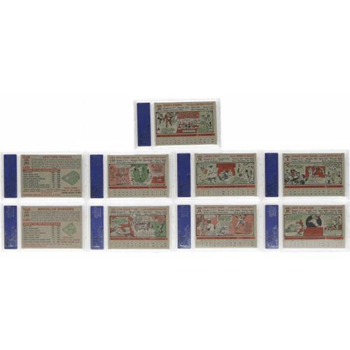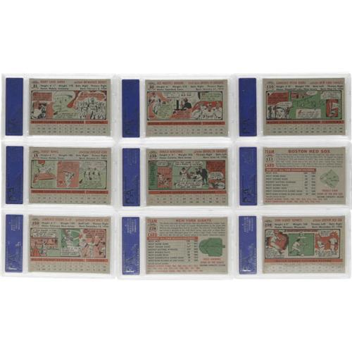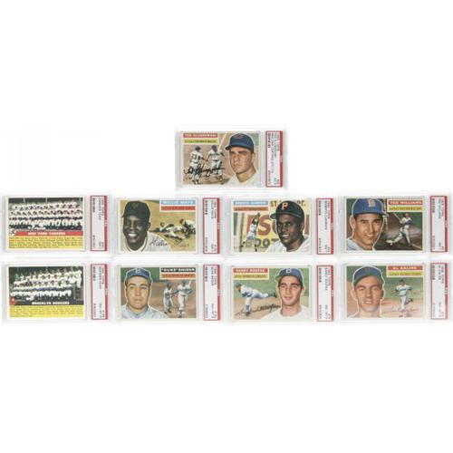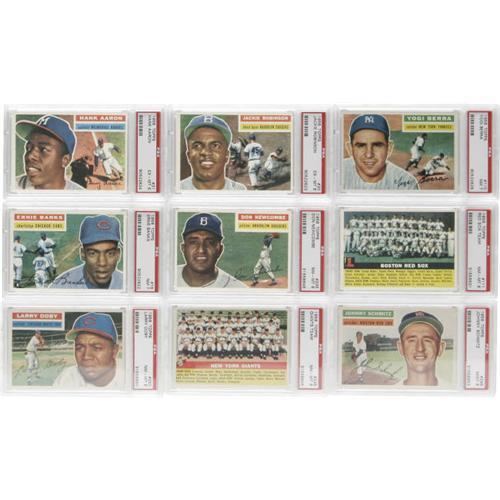 <B>1956 Topps Baseball High-Grade Near Complete Set (334/340) with Autographs.</B></I> This high-grade partial set represents the second consecutive year that Topps employed the horizontal cards featuring both a portrait and an action scene. Includes all but six cards, missing only #10 Spahn, 39, 106, 135 Mantle, 154 and 182. A total of 47 cards have been graded by PSA with an aggregate SMR value of $6,275. Includes: Graded Cards - <B>PSA Mint 9:</B></I> 1 card - #298 Johnny Schmitz (10 extant with none grading higher). <B>PSA NM-MT 8:</B></I> 29 cards - #20 Kaline, 23, 26, 32, 40, 43, 79 Koufax, 111 Red Sox Team, 150 Snider, 151, 166 Dodgers Team, 172, 176, 184, 185, 189, 191, 207, 211, 226 Giants Team, 235 Newcombe, 237, 242, 243, 250 Doby, 271, 286, 305, 313. <B>PSA NM 7:</B></I> 15 cards - #4, 5, 14, 15, 33, 35, 101 Campanella, 110, 130, 198, 213, 220, 251, 301, 331. <B>PSA EX-MT 6:</B></I> 2 cards - #30 Robinson, 31 Aaron. A total of 87 cards have been signed including <B>PSA/DNA</B></I> #25 Kluszewski; #113 Rizzuto, 155 Kuenn, 164 Killebrew, 192 Burgess, 194 Irvin, 195 Kell, 260 Reese, 307 Wilhelm. Balance of the cards grade EX-MT or better with few exceptions. <I>LOA from PSA/DNA.</B></I> <BR><BR><B>Important notice:</B> Heritage usually auctions material at the rate of 200-250 lots per hour. On some occasions eBay Live bid software or the Internet may not be able to keep up with the pace of the auction. We recommend placing a realistic absentee bid now as insurance to avoid disappointment. Occasionally the auctioneer may eliminate or reject an eBay Live bid, and the auctioneer may also reopen a lot after the close of the eBay live bidding (usually because we missed an audience bid), and may reject your bid even if it shows you as the winning bidder. By bidding via eBay Live, you agree that Heritage may award the lot to another bidder at its sole discretion under the circumstances described above or any other reasonable circumstances. Since eBay bids are not shown to us until we open the lot on the floor, we treat those bids just like floor bids. In most cases the floor responds before the eBay bid is presented to us, due to Internet lag time, so for consistency we have made it a policy that floor bids are always considered first over tie eBay live bids. Also please note that all Heritage lots purchased through eBay Live carry a 22.5% Buyer's Premium. Please make sure you read the Terms and Conditions before you bid. This lot is being auctioned in conjunction with a live floor auction by Heritage Galleries & Auctioneers. All final auction and invoice information will be supplied by Heritage Galleries & Auctioneers, and all other information should be considered preliminary. Lot:19571 <BR><BR><B>Winning Notification and Billing:</B> After the FINAL session in this auction is complete, Heritage will send e-mail and snail mail invoices. This process normally takes several days. All final auction and invoice information will be supplied by Heritage Galleries & Auctioneers, and all other information should be considered preliminary. <BR><BR>This auction will be conducted on a live auction floor and over the Internet through eBay Live. If you choose to place an absentee bid, please take a moment to <font color='#0000ff'><u><a href='http://pages.ebay.com/liveauctions/help/before/laabsentee.html'>learn how eBay Live absentee bidding works</a></u></font><font color='#000000'>