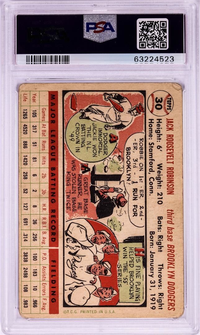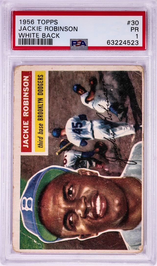 One 1956 Topps Jackie Robinson (White Back) MLB Card #30 PSA Poor 1. PSA Certified.