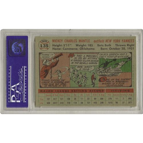 <B>1956 Topps Mickey Mantle #135 PSA NM 7.</B></I> That big Oklahoma smile suggests that the Mick may have known that this would be his greatest season ever. Fine artifact from that Triple Crown and World Championship season boasts flawless color and registration, and surfaces so clean you could eat off of them. A real beauty.<BR><BR><b>Shipping:</b> Sportscard (<a target="_blank" href="http://www.heritageauctions.com/common/shipping.php">view shipping information</a>)