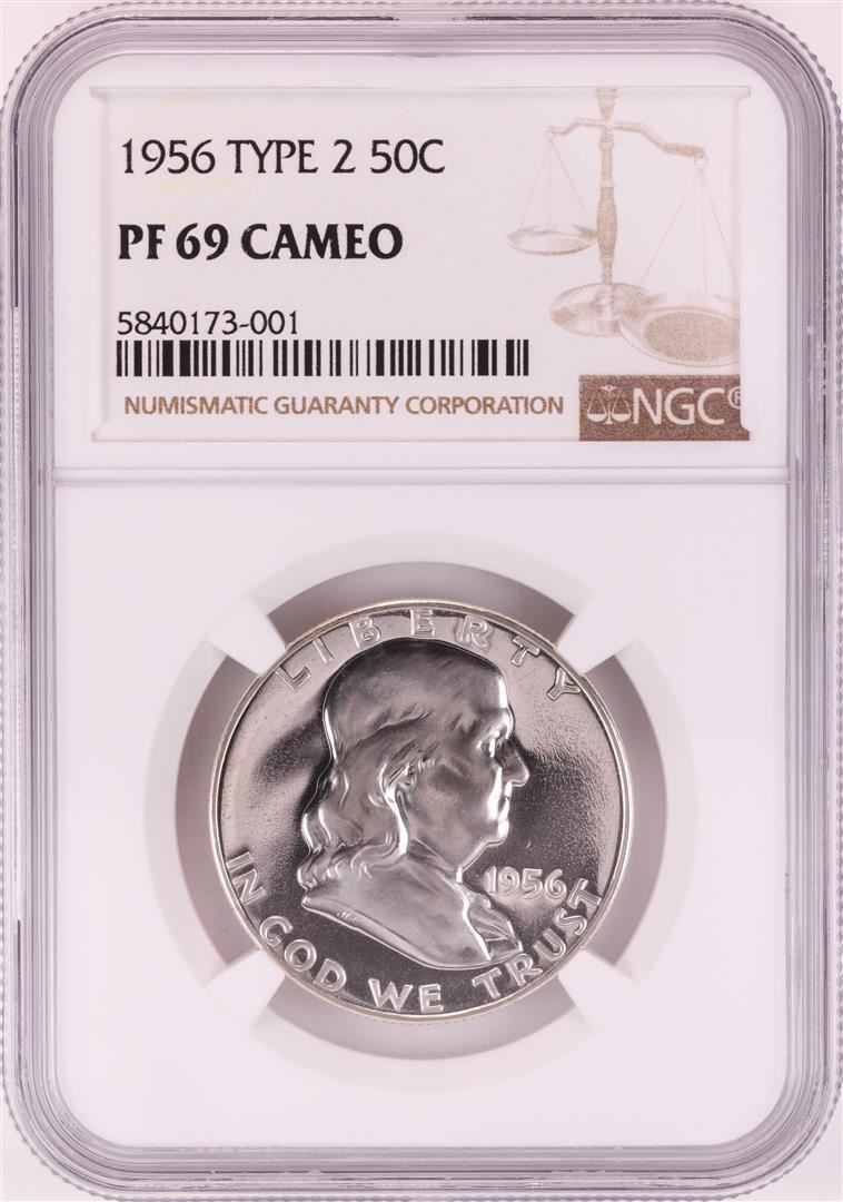 One 1956 Type 2 Proof Franklin Half Dollar Coin NGC PF69 Cameo. NGC Certified.