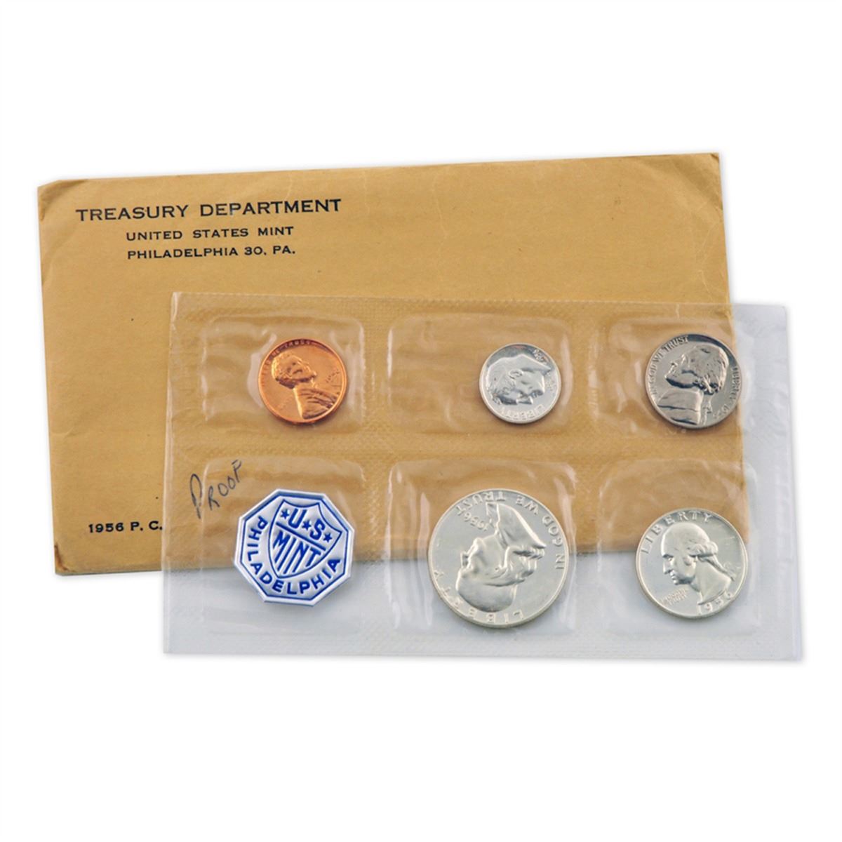1956 United States Mint Proof set in Original Government Packaging.. 1956 Philadelphia United States Mint set in Original Government Packaging. Set includes 1 Penny, 1 Dime, 1 Nickel, 1 Quarter, and 1 Half. Original packaging: Pliofilm packaging, similar to Proof Sets. The five coins from the Philadelphia Mint were placed in individual compartments in one pliofilm pack.