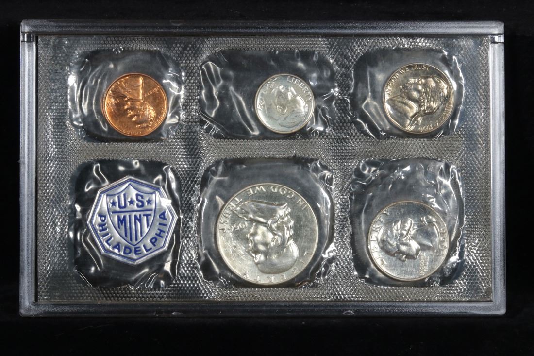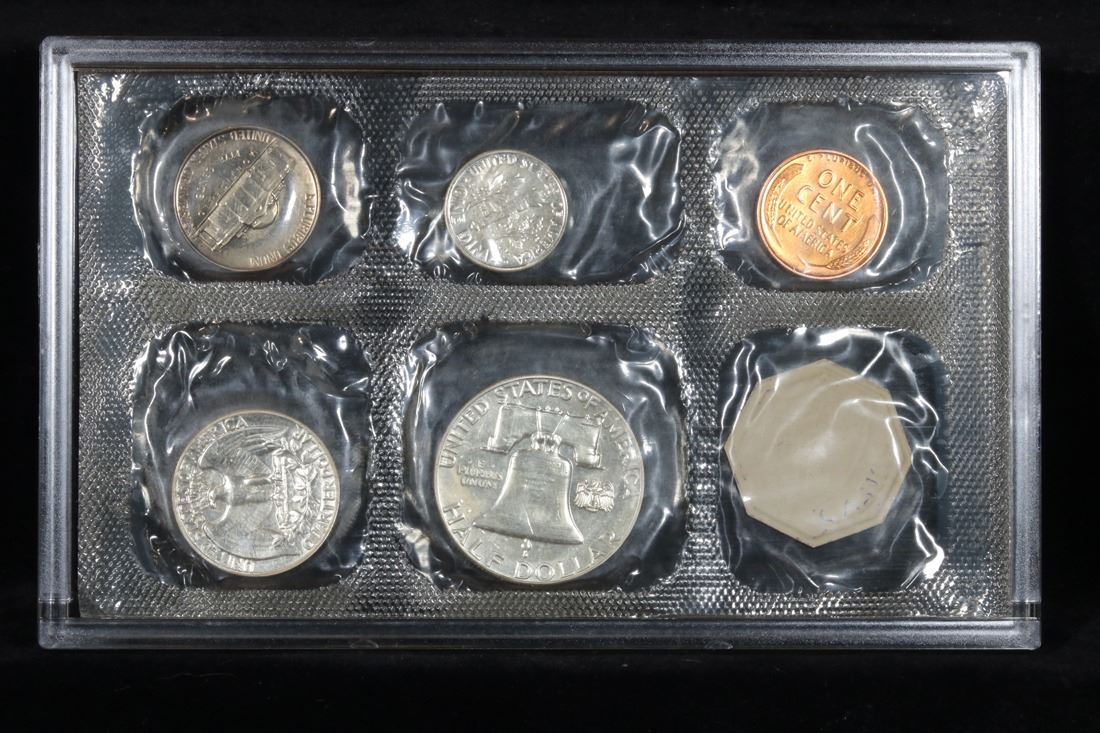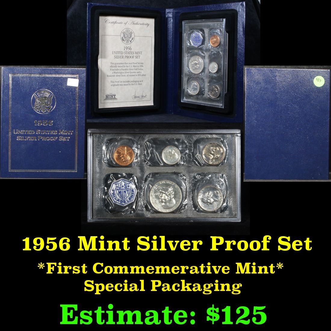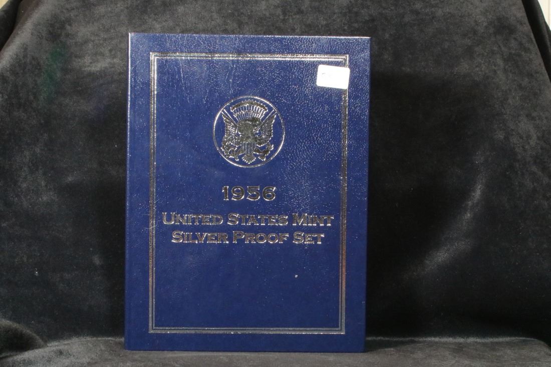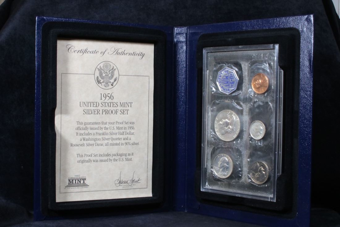 1956 United States Mint Silver Proof Set . .. The set, has a 90% Proof Silver Franklin Half Dollar (type 2), a 90% Proof Silver Quarter, a 90% Proof Silver Dime, plus the proof nickel and penny. All coins in the original cellophane. This is housed in a book type folder from the Modern Commemoraltive Mint with a certificate of authenticity.